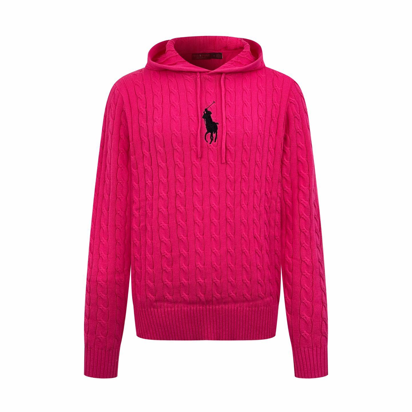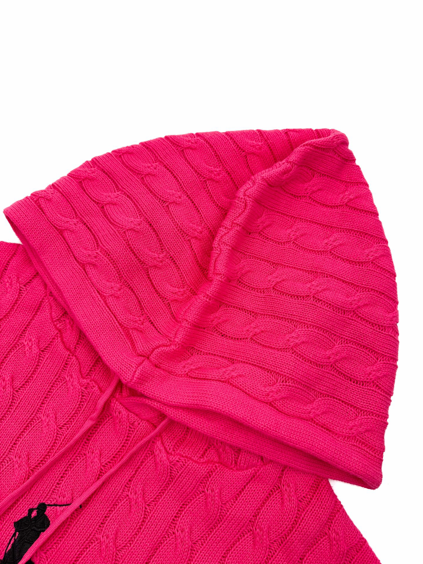 This plush wool cable knit is light, warm, and comfortable against the skin. Using fiery pink as its canvas, a touch of black adds a subtle highlight. Daring to stand out, yet knowing how to restrain oneself, the iconic horse logo embroidered on the chest adds an unexpected yet captivating romance, embodying the gentleman’s style philosophy. The classic cable knit structure is infused with soul, its precise and orderly arrangement complementing the hood. The interplay of strength and softness gives the classic a futuristic feel, making retro anything but old-fashioned, upholding timeless elegance and taste.